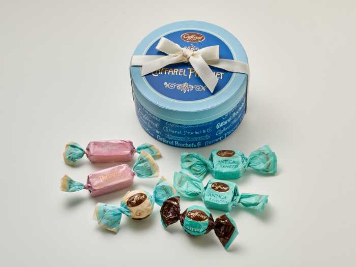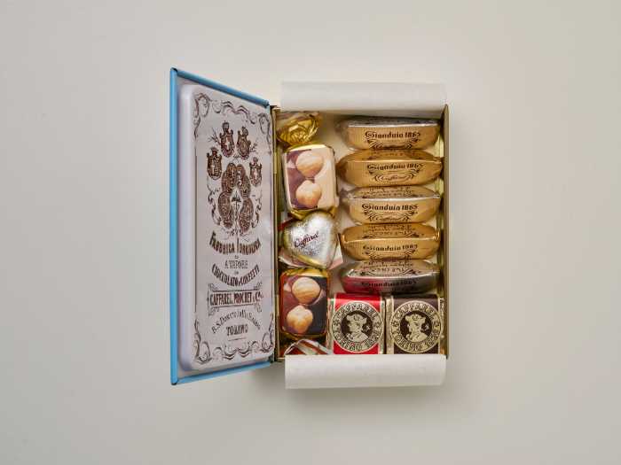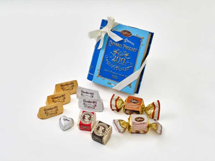 サヴォイアブルーが美しいブック型「200アニヴェルサリオ ストーリア」(3,240円・10粒)には、新味ピエモンテ“ビグスト”もIN。