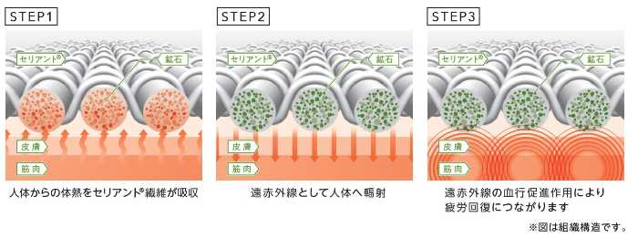 体温を吸収して遠赤外線として輻射することで、疲労回復効果が期待できる※3)仕様。身生地にはリサイクルポリエステルを40%使用し、サステナブルな視点も兼ね備えています。