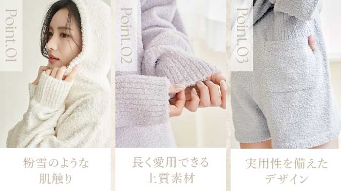 1日の終わりを癒やす「P.snow」シリーズは、粉雪のような軽やかさとやさしい触感が特徴。毛玉になりにくい上質素材を採用し、ポケット付きなど実用性にもこだわっています。