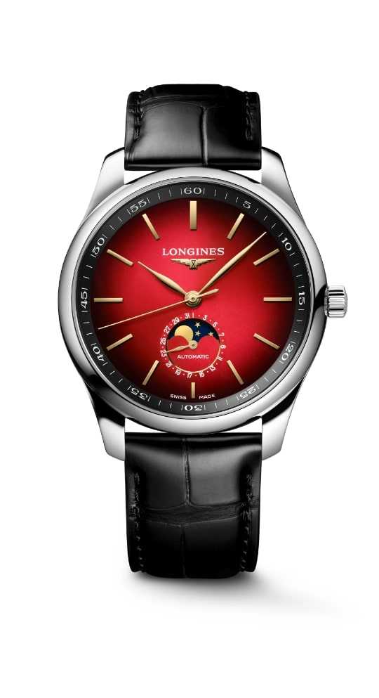 ゴールドカラーの針とアプライドインデックス、6時位置のムーンフェイズ表示が、洗練されたフェイスを完成させます。