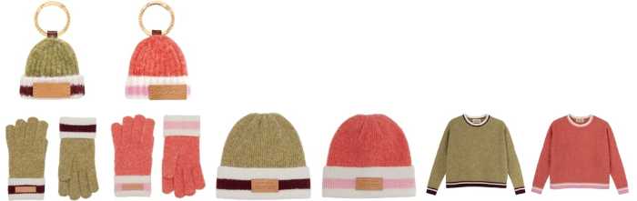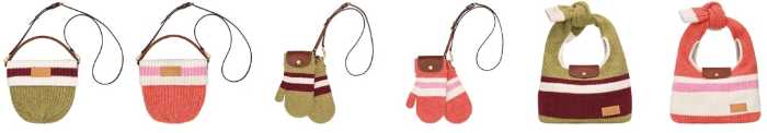 素材はウール35%、ポリエステル35%、ポリアミド24%、エラスタン6%(一部カウハイド)、カラーはピスタチオ&バーガンディ、コーラル&ピンク。