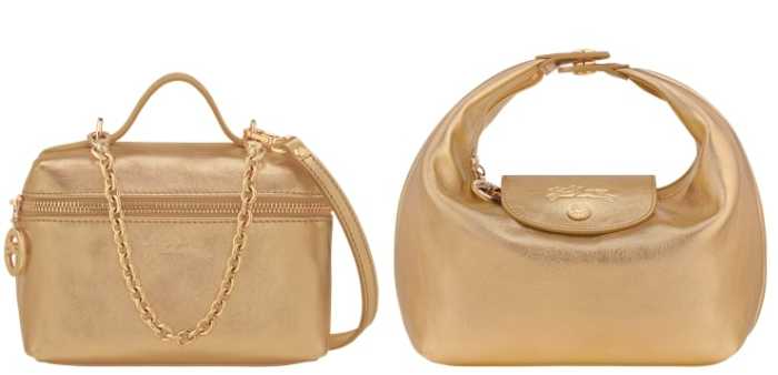 夜の装いには「Le Pliage® Xtra Gold」。H10×W16×D11cm(クロスボディバッグ)70,400円、H18×W18×D12cm(トップハンドルバッグ)70,400円、カーフスキン100%、ゴールドカラー。