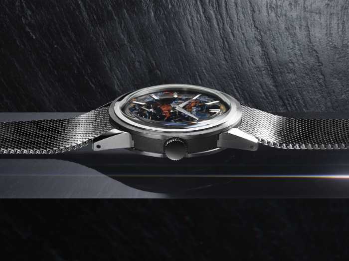 36mmのケースは、ステンレススチールとグレード5チタニウムを組み合わせた5パーツ構造。薄さ9.2mm(ガラス除く7.4mm)のスリムな設計で、ドレスウォッチらしい上品さを演出します。