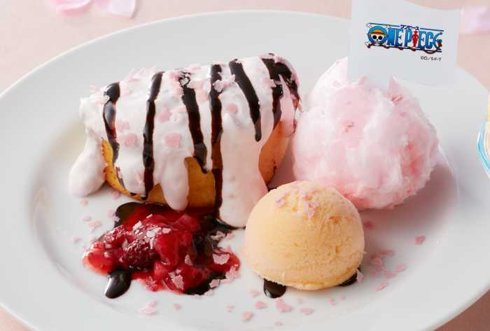 チョッパーの「桜舞うホットケーキプレート」は、ピンク色のクレープ生地と桜の花びらが舞い散る美しいデザート。価格は768円(税込)です!