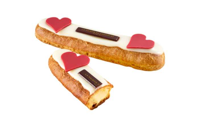 「エクレールバニーユクール」は、ショコラブランとバニラが織りなすやさしい甘さに、ハート型ショコラを添えた新年限定エクレア。外側はカリっと、内側はもちっとした生地の食感も楽しめます。