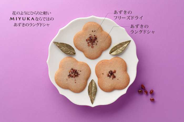 MIYUKAのロゴをかたどった花形に、中央にはあずきのフリーズドライをあしらい、和素材をモダンに表現しています。ほんのり紫色の生地が、名前の由来をそっと物語ります。