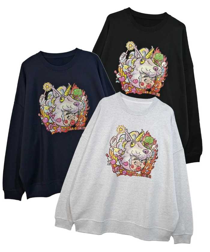 【mune x Briana Gigante Bari Cawaiiビッグシルエットトレーナー「ユニコーンの皮をかぶった娘」】価格11,000円(税込)。