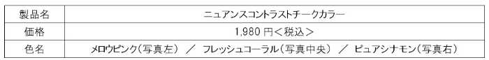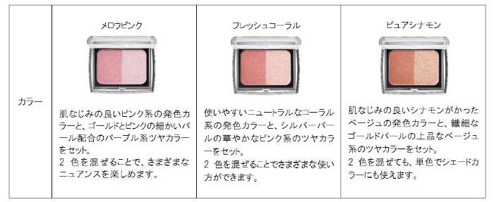 「ニュアンスコントラストチークカラー」は、発色の良いカラーとツヤのあるカラーを組み合わせたチークカラーパレット。
