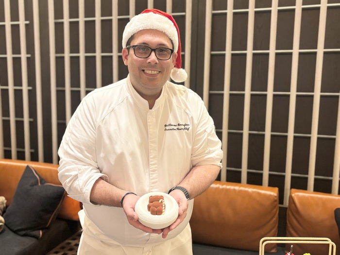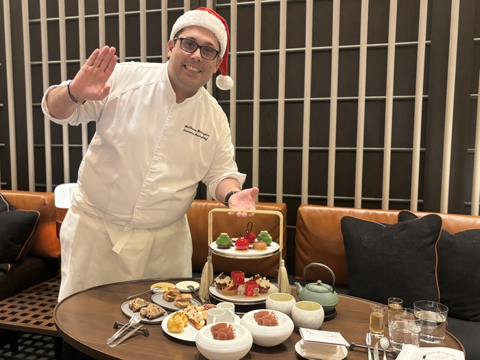 この日は、特別にシェフもサンタクロース姿で登場!シェフとっておきのスイーツ、一日20食限定 フェスティブ アフタヌーンティーをご紹介。(この日は、サーブ中のタイミングでシェフがいらっしゃったので特別に撮影させていただきました。)