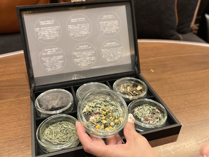 京都宇治山政小山園ティーセレクションから、実際に手に取り、茶葉の香りを嗅いで選べるので、日本茶本来の味と香りを味わっていただけます。京都の老舗「小川珈琲」のコーヒーなどもフリーフロー。