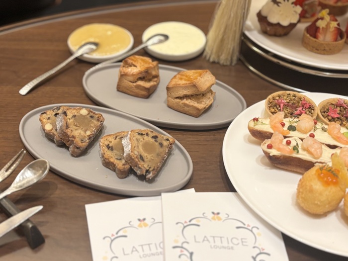 開放感あふれる広々とした、吹き抜けの空間。ホテルのコンセプトは、「京都SYNAPSE(シナプス)」。京都の織物をモチーフとした、織物を象徴する洗練されたロビー1階。ロビーラウンジ&バー「LATTICE LOUNGE(ラティス ラウンジ)」では、1日20食限定でフェスティブ アフタヌーンティーが開催中です。