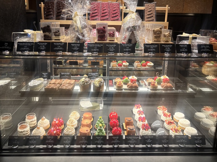 ショケースには、シェフ特製のスイーツがたくさん並んでいます。カラフルなケーキに、自家製のショコラやペストリーなど、手土産やギフトにもぴったりなアイテムがたくさん販売されています。
