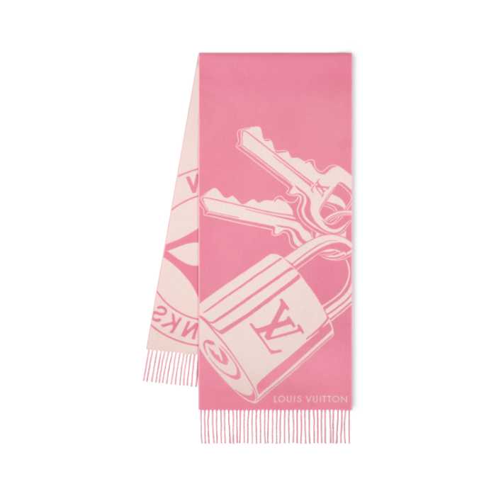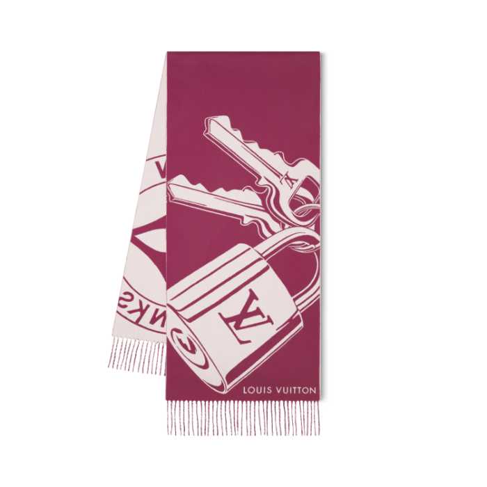 片面には2つの鍵を添えたLVパドロック、もう片面には「LouisVuittonTrunks」メダリオンを配し、冬の装いに物語性を添える存在感ある一枚です。