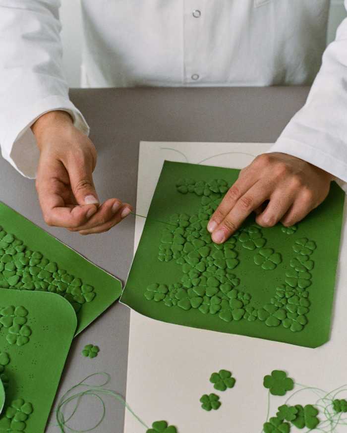 本作は、ディオールが誇る卓越したサヴォワールフェールによって丁寧に製作されています。クローバー一つひとつにホットスタンプを施し、その後すべて手作業で刺繍。