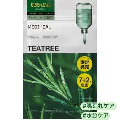 洗顔後すぐに使える「メディヒールティーツリー(※4)3ミニッツ(※1)マスク」も、今回限定で2枚増量。通常7枚入りのところ、9枚入りで登場します。