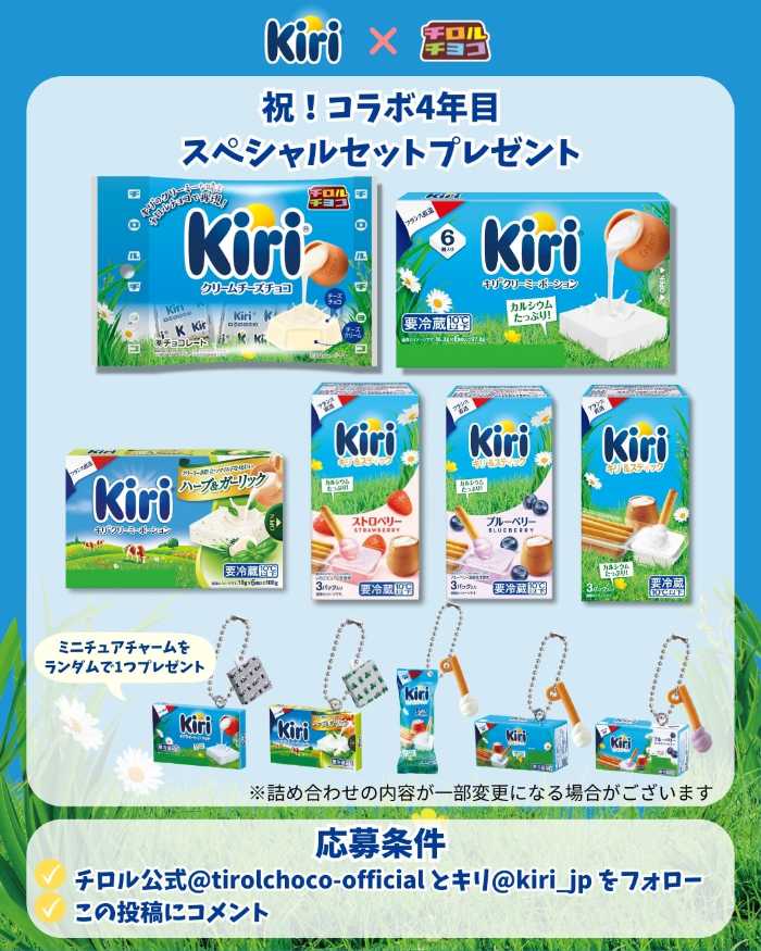 さらに、チロルチョコ公式オンラインショップでは、「クリームチーズチョコ〈袋〉1箱(10袋)」を2点以上購入すると、キリミニチュアチャームを1点ランダムでプレゼントする企画も登場します。