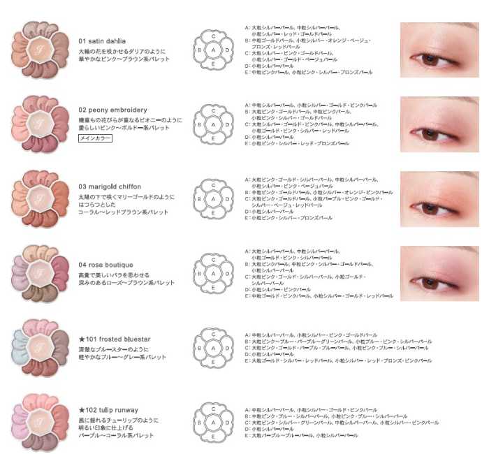 AのベースカラーからEの締め色まで計算された構成で、重ねるほどに瞳の印象が引き立ちます。透明感と輝きを両立した“重ね咲きアイ”は、春メイクの新定番になりそう♪