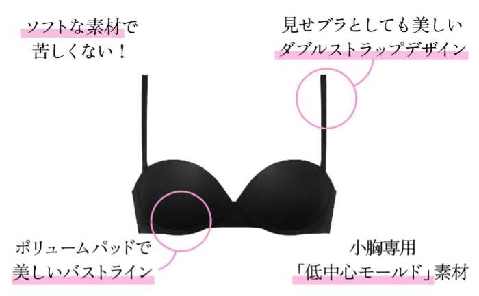 モールド開発専門企業と共同で開発された「小胸専用の低中心モールド」により、カップ上部の浮きや隙間を解消し、フィット感も抜群です。