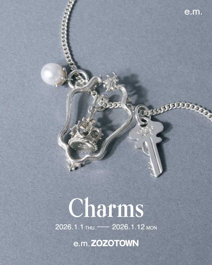 e.m.のチャームイベント「Charms」は、選ぶ時間そのものが思い出になる特別な体験。実店舗での開催はなく、ZOZOTOWN限定だからこそ出会えるラインナップです。