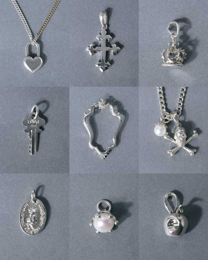 Heart lock20,900円、Cross23,100円、Crown19,800円、KEY16,500円、Dream frame14,300円、Skull25,300円、Milk crown pearlΦ7mm16,500円、e.m.Medal17,600円、Milk crown pearlΦ10mm19,800円、Worm-eaten apple30,800円(すべて税込)。