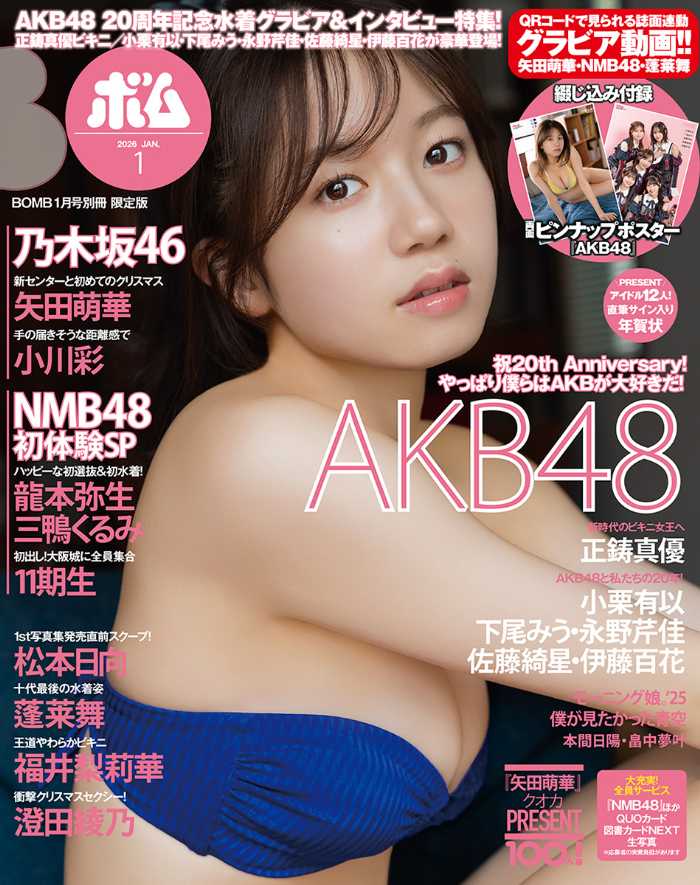 年末ムードが高まるこの季節、アイドルファンの注目を集めているのが「ボム1月号」。乃木坂46の矢田萌華が初表紙を飾り、誌面全体が冬のときめきで満たされています。さらに限定版ではAKB48やNMB48の人気メンバーも登場し、グラビアから座談会まで内容は超充実。今号は2025年の締めくくりにふさわしい、見逃せない一冊となっています♪