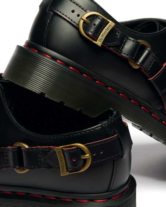 ブラックレザーにアンティークゴールドのハードウェアが施されたブーツとシューズは、どちらもドクターマーチンならではのユニークな魅力を放っています。
