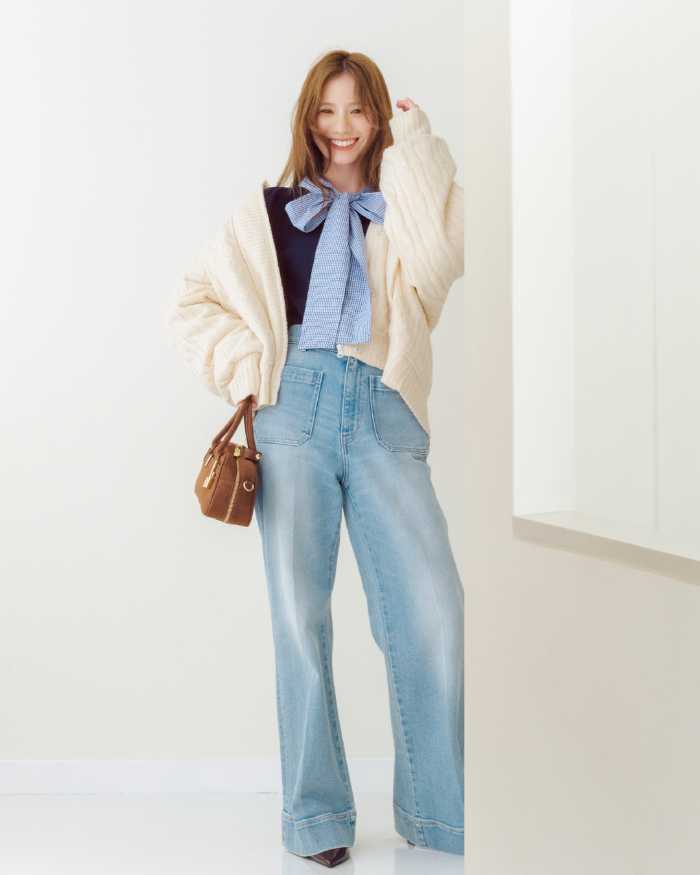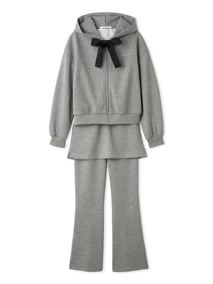 丸みのあるコンパクト丈のフーディーと、脚長効果が期待できるフレアシルエットのパンツが、カジュアルさと女性らしさを絶妙にミックス。