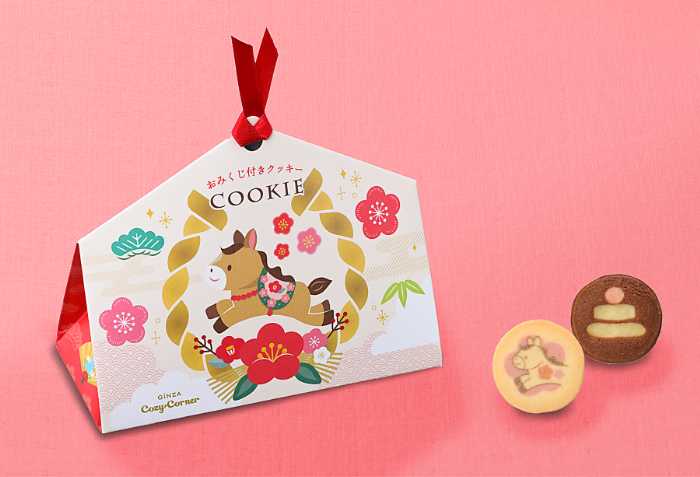 新年にぴったりな「おみくじ付き絵馬クッキー」は、干支の“午(うま)”をイラストにあしらった絵馬型ボックスに入ったクッキーセット。