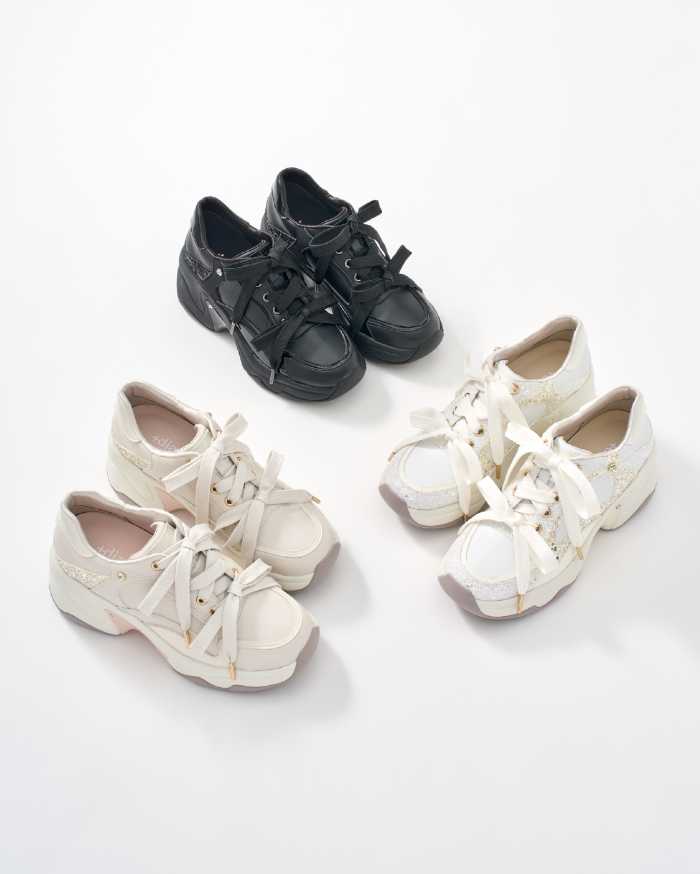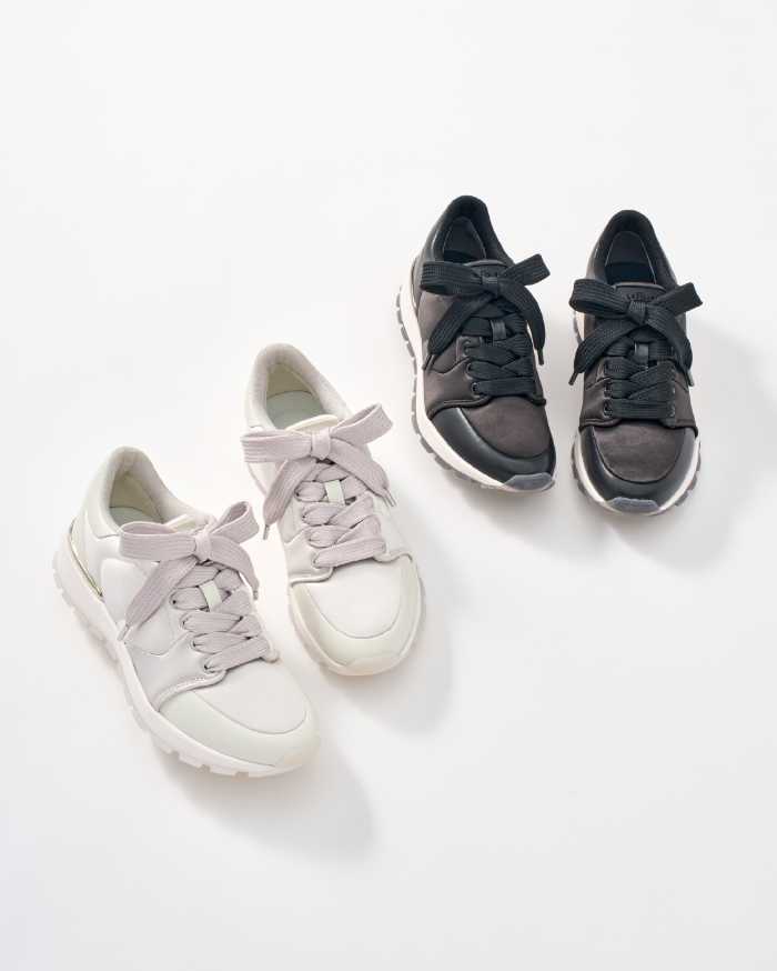 さらに【SATIN SNEAKERS】はヒール高3㎝台、サイズ21.5-25.5cm、クロサテン/アイボリーサテンの上品な素材感が魅力で、価格は17,600円(税込)です。