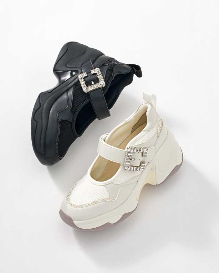 【VOLUME SOLE SNEAKERS】はヒール高8㎝台で、サイズ21.5-26.0cm、カラーはクロ/エクリュ/シロ、価格は19,800円(税込)。
