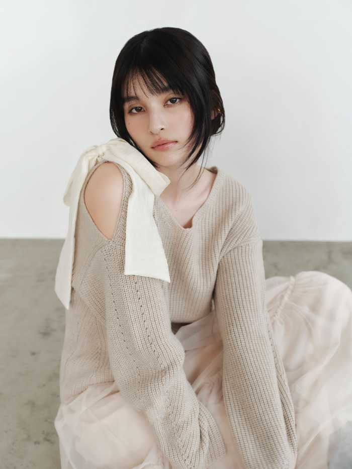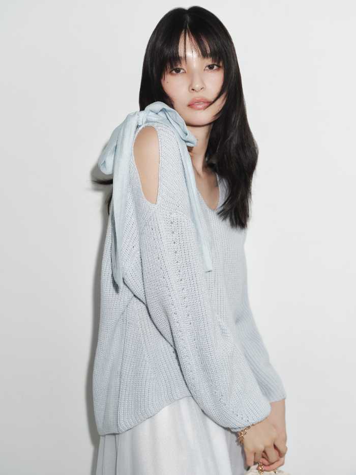 「リボンニットプル&チュールスカートセット」は、女性らしさを引き立てるKNIT SET-UP。大きなリボンが目を引くニットプルオーバーは、右肩のさりげない開きで上品な肌見せを叶えます。