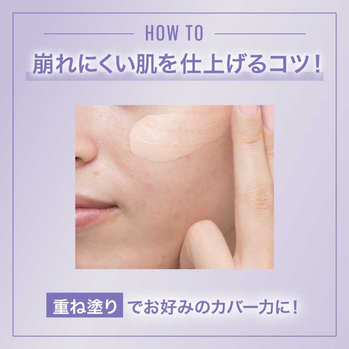 使い方はとてもシンプル。約半プッシュで全顔に使用でき、少量を素早く伸ばしてなじませるだけ。さらにカバーしたい部分は重ね塗りで調整可能です。