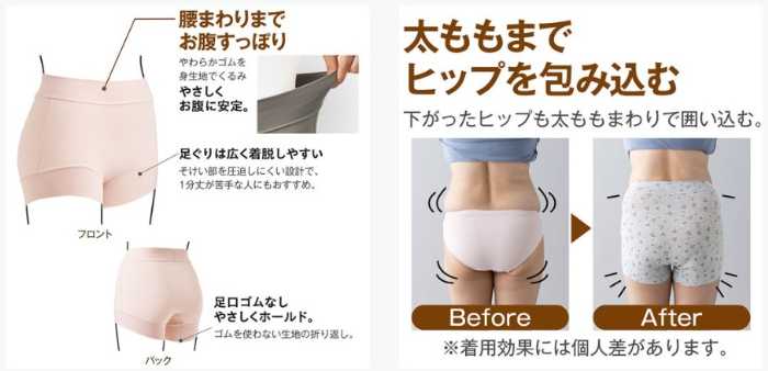 大人世代のお悩みである「お肉のはみ出し」を解消するため、深めの履き込み丈でヒップをしっかり包み込む設計。太ももまでカバーできるので、見た目もすっきり♡