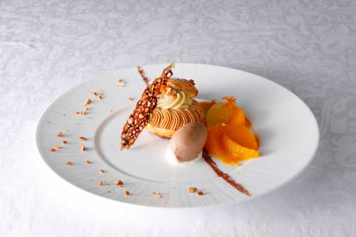 今月のおすすめデザートとして、「国産くるみを使用したパリブレストチョコレートのアイスクリーム添え」2,700円、「青森県産“グラニースミス”のタルト・タタンシードルのアイスクリームとともに」2,700円も用意されています。