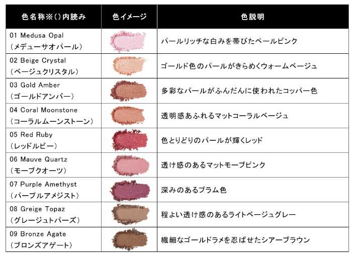 全9色は天然石の色彩にインスピレーションを受け、ハイライター、チーク、アイシャドウ、シェーディングなどマルチユースで使用可能。