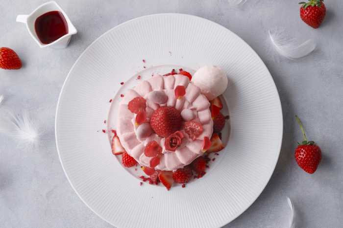 「ストロベリーロゼパンケーキ」(3,300円)は、淡いロゼの世界観が広がる可憐なスイーツ。