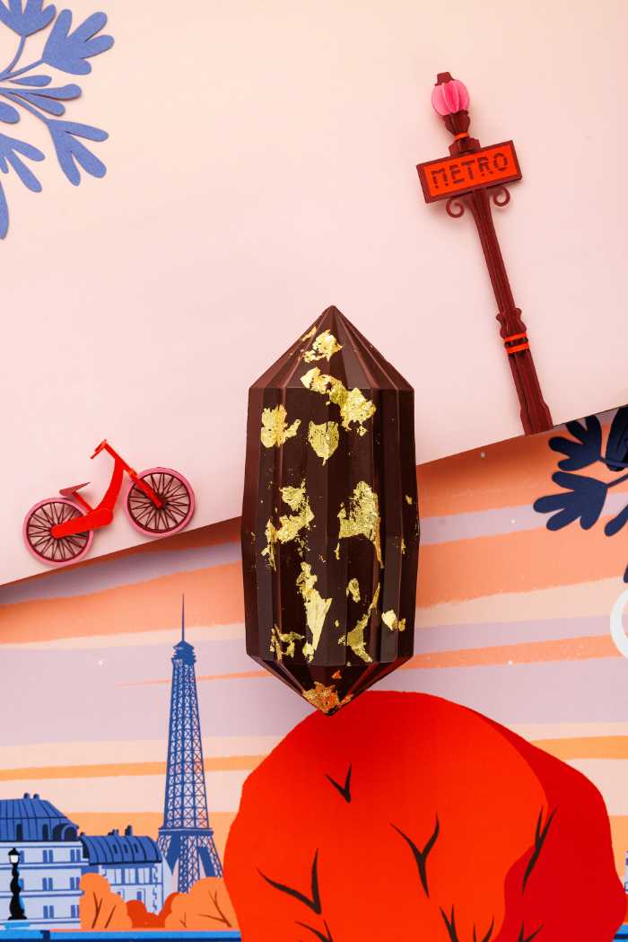 「カボス・プラリネ」(6,804円)は金箔が美しいカカオポッド型。ヘーゼルナッツ×カカオニブのプラリネとカカオ75%ショコラ ノワールの重なりが香ばしく上品な味わいです。