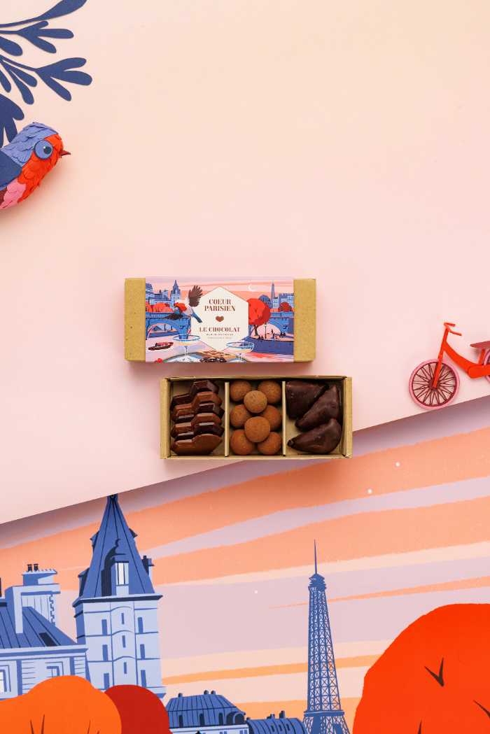 オンライン限定商品も魅力的。「コフレ・プレジール 3種」(3,240円)はヘーゼルナッツドラジェ、オレンジコンフィに加え、限定のハートショコラを詰め合わせ。