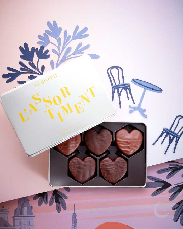 おばあちゃんの味をイメージした人気商品「ピュール・ブール」をハート型にした「ピュール・クール」は、ショコラ ノワール&オ・レの2種をコーティング。