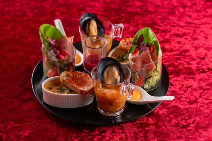 セイボリーには、エミリヤ風小さなラザニア、温かい魚介のブイヤベース風スープ、苺と生ハム“ハモンセラーノ”のサラダ仕立てフランボワーズドレッシングを用意。