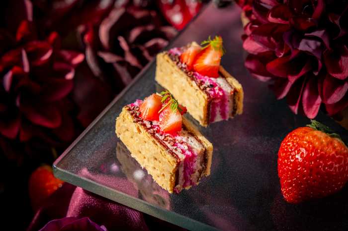 鴨の生ハムといちご、カカオを重ねたミルフィーユサンドや、いちごと生ハムのカプレーゼなど、甘酸っぱさと塩味のマリアージュが楽しめます。