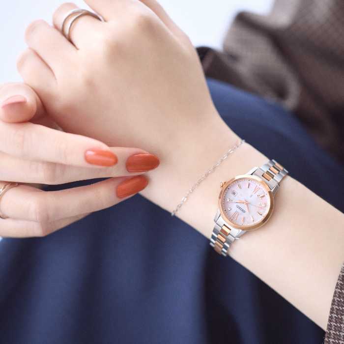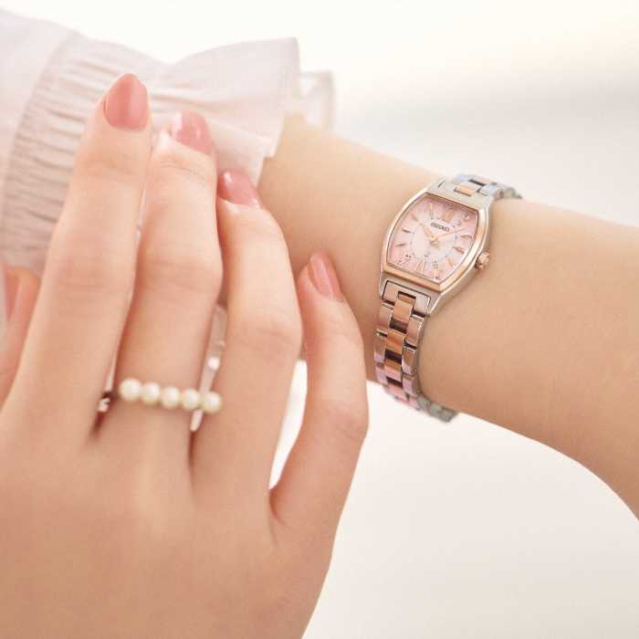 <セイコールキア>からは、トノー形SSWA018と丸形SSVW244の2モデルが登場。どちらも白蝶貝ダイヤルに柔らかなピンクグラデーションを重ね、揺らめく水面に映る八重桜を表現しています。