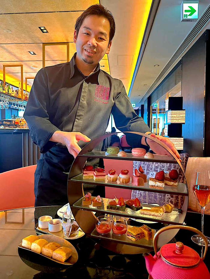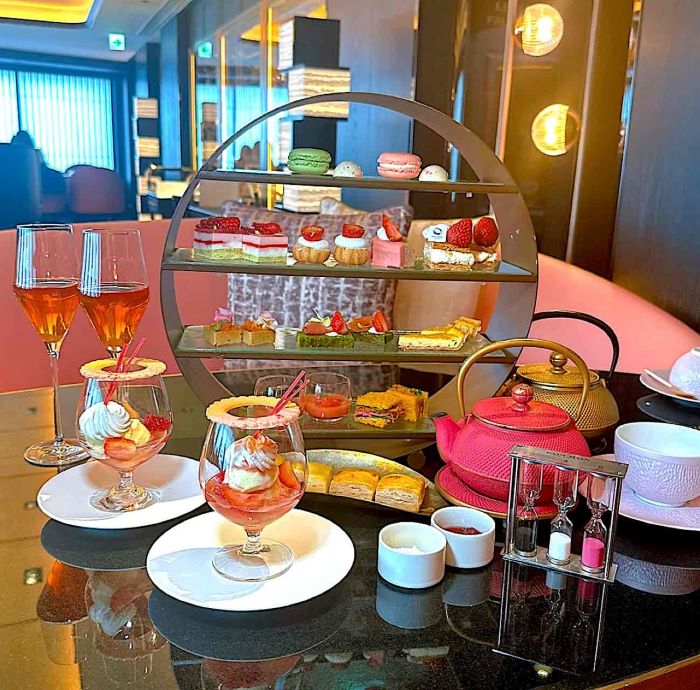 アフタヌーンティーの特製ティースタンドには、シェフ監修のアートのように美しいセイボリーが並びます。シグネチャーカラーのピンクが彩るモダンな空間で、旬の素材の魅力を丁寧に引き出した、気品あふれる美しさに定評があります。