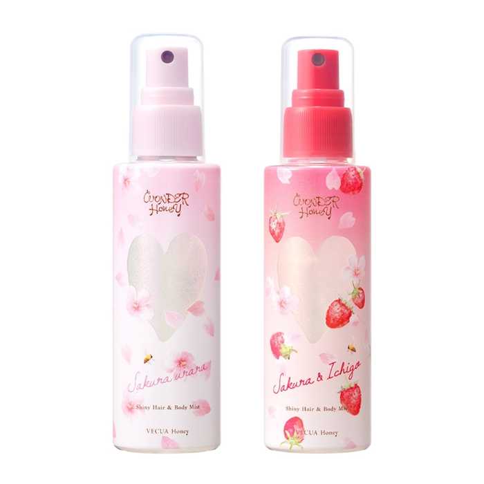 VECUA Honeyワンダーハニーきらめきヘア&ボディフレグランスミストはサクラウララ/野イチゴサクラの2種展開で各1,650円。