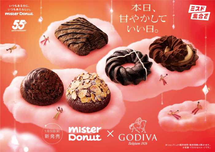 ミスタードーナツとゴディバ、節目の年を迎えた二つのブランドが出会い、心ときめくショコラコレクションが誕生しました。『Mister Donut×GODIVA』は、55周年と100周年という特別な想いを重ねた期間限定シリーズ。日常に寄り添うドーナツと、世界が認めるプレミアムチョコレートの融合が、寒い季節にぴったりのご褒美時間を演出します。今年だけの特別な味わいに注目です♡