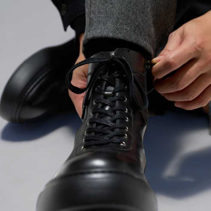 レースアップならではのホールド感を、ソフトナッパレザーの柔らかさで快適に表現。さらにサイドジッパー付きで、着脱のしやすさにも配慮されています。