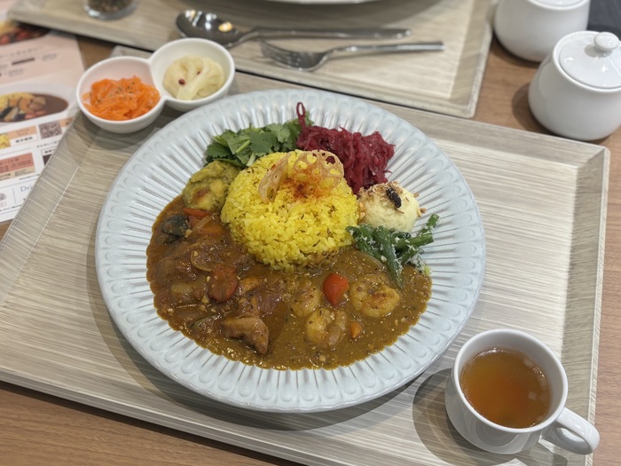 ココナッツミルクを使用したクリーミーなカレーソースにマスタードをきかせ、エビのうまみが感じられる「エビマスタードスパイスカレー」(期間限定)ゴロゴロとしたエビがたっぷり!