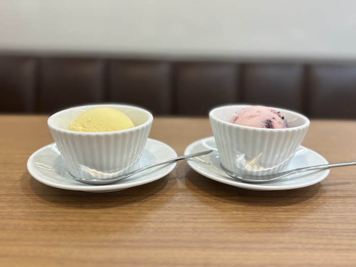 デザートには、カレーの後にさっぱりといただけるKITTE大阪店限定のジェラート、「大阪ミックスジュース」。爽やかで甘酸っぱい味わいの「ベリーヨーグルト」・「北海道ミルク」・「マサラチャイ」の全4種類ご用意。