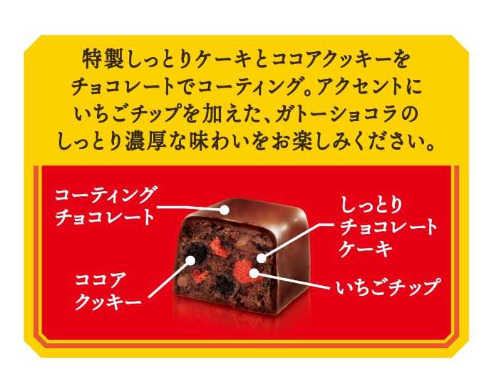 チョコレートでコーティングされたケーキ生地に、フレッシュな香りと爽やかな酸味が特徴のいちごチップをプラス。ガトーショコラのコク深さの中に、いちごの軽やかなアクセントが広がります。