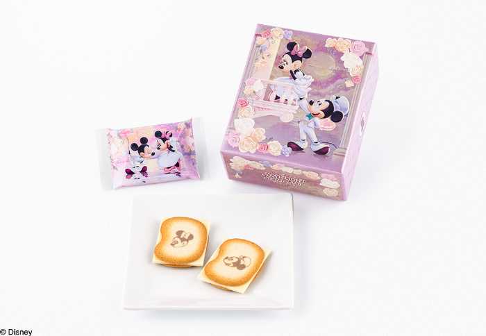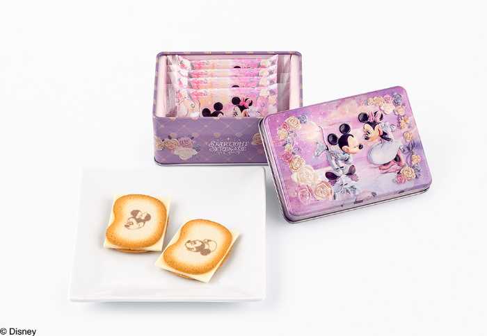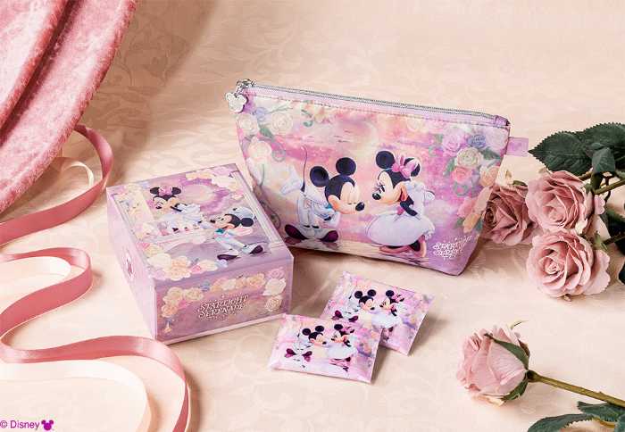 10枚入ボックスは、星を集めたハートをミニーマウスに贈るミッキーマウスを描いた特別デザインで、パール加工が月明かりのような上品な輝きを添えています。